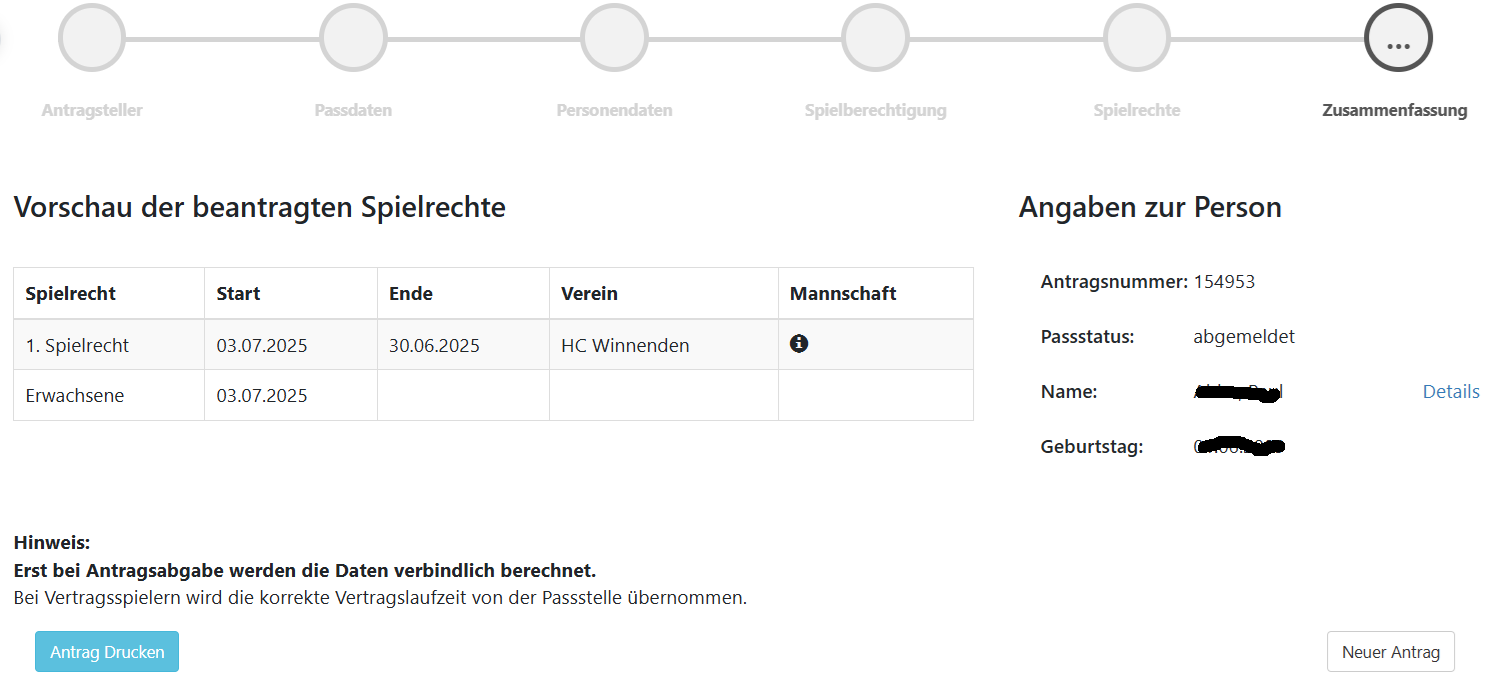 Nachdem die benötigten Spielrechte eingetragen wurden, sind alle benötigten Daten erfasst. Im nächsten Schritt der geführten Aktivität wird nochmals eine Zusammenfassung der Antragsdaten bereitgestellt und der Antrag kann über den Button “Antrag Drucken” erzeugt und z. B. als PDF Datei gespeichert werden.