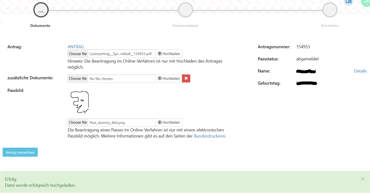 Nach dem Einreichen wird hier jedoch kein vorläufiger Spielausweis erstellt.