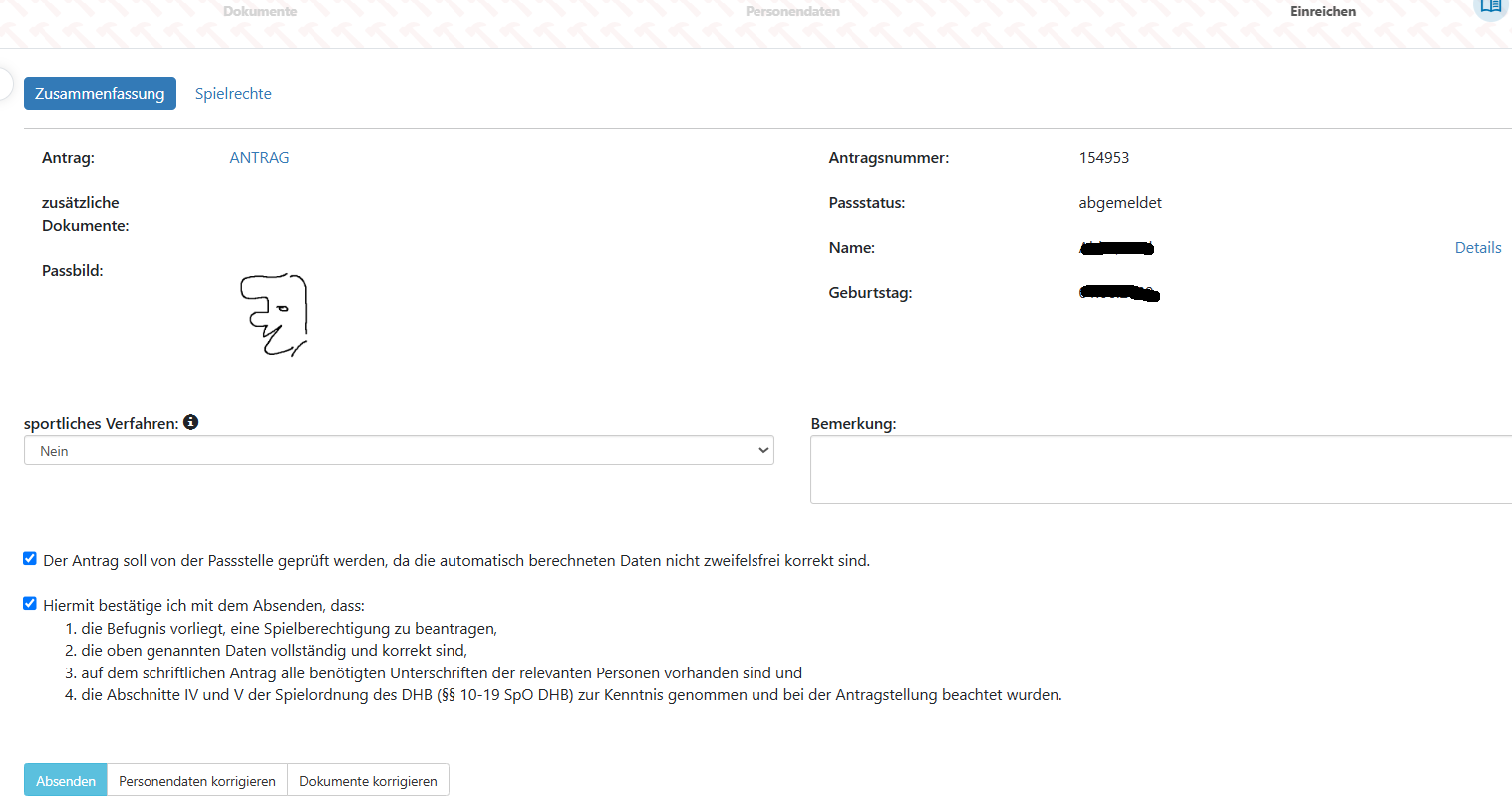 Bevor die Daten zur PassStelle übermittelt werden können, muss man angeben, ob ein sportliches Verfahren gegen die Person vorliegt. Ebenso können Bemerkungen an die PassStelle übermittelt werden oder es kann die Checkbox geklickt werden, damit die PassStelle die angegebenen Daten auf Korrektheit überprüft. Sind nun alle Angaben eingegeben, lässt sich der Button “Absenden” anklicken und der Antrag wird bei der PassStelle eingereicht.