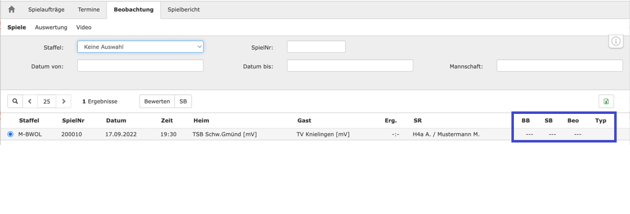 In der Anwendungsmaske werden die Spiele angezeigt, für die eine Beobachtung für den Schiedsrichter vorliegt. Die blau umrandeten Felder haben folgende Bedeutung: