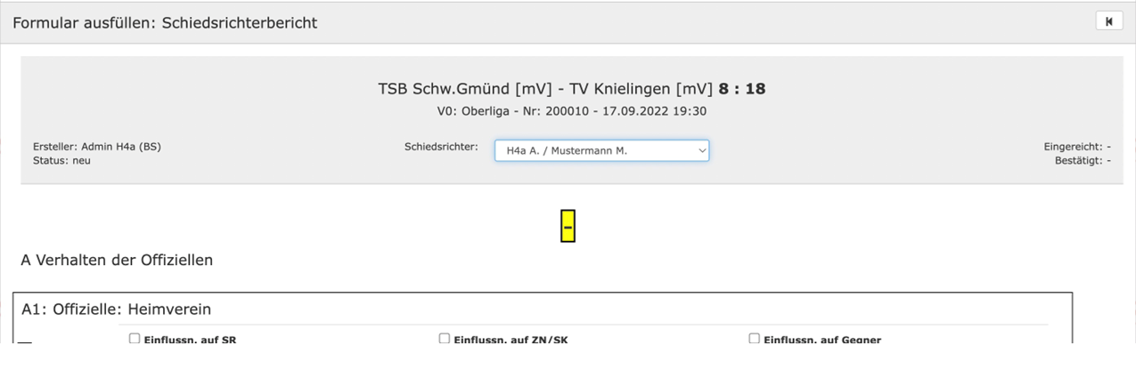 Durch Klick auf den Button “SB” oberhalb der Tabelle, wird das Formular für den Schiedsrichter Bericht aufgerufen.