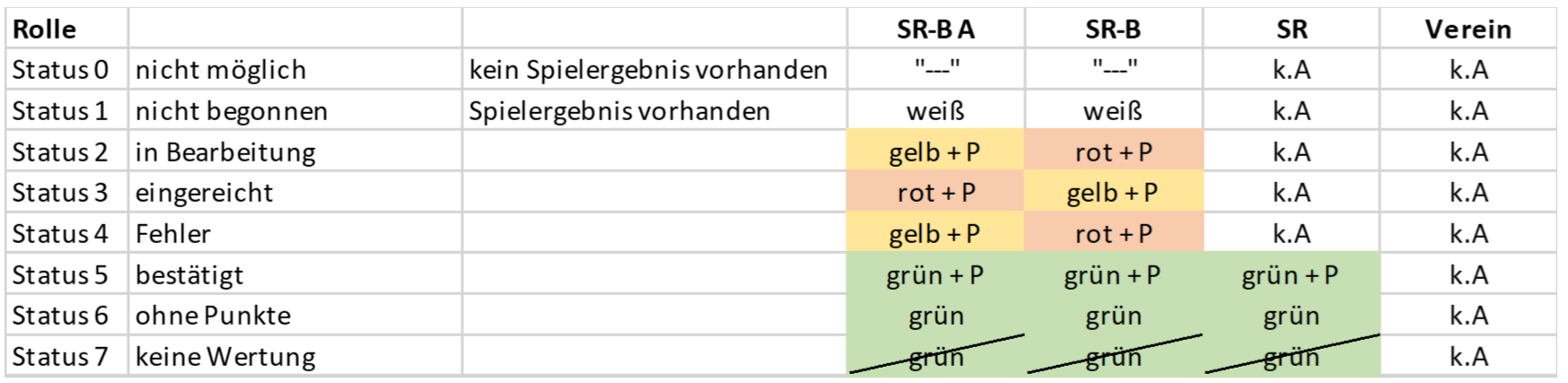 | Status 0 | nicht möglich | Es ist noch kein Spielergebnis vorhanden. Eine Bewertung ist nicht möglich. Sowohl der Beobachter Admin (SR-B A) als auch der neutrale Beobachter (SR-B) sehen für das Spiel nur den Status “–”. Dies bedeutet, es muß eine Beobachtung stattfinden, Spiel ist aber noch nich bereit. |