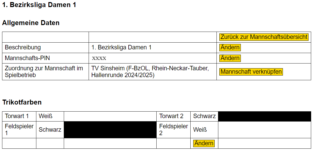 - In der Zeile Zuordnung zur Mannschaft im Spielbetrieb muss der Mannschaftsname nun einer Spielklasse zugeordnet werden. Hierzu ist wieder Ändern auszuwählen.