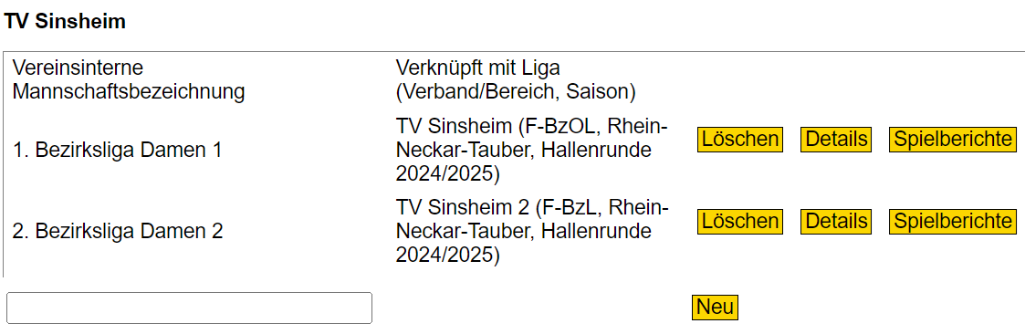 In der dann erscheinenden Übersicht ist hier im Screenshot eine Mannschaft bereits angelegt.