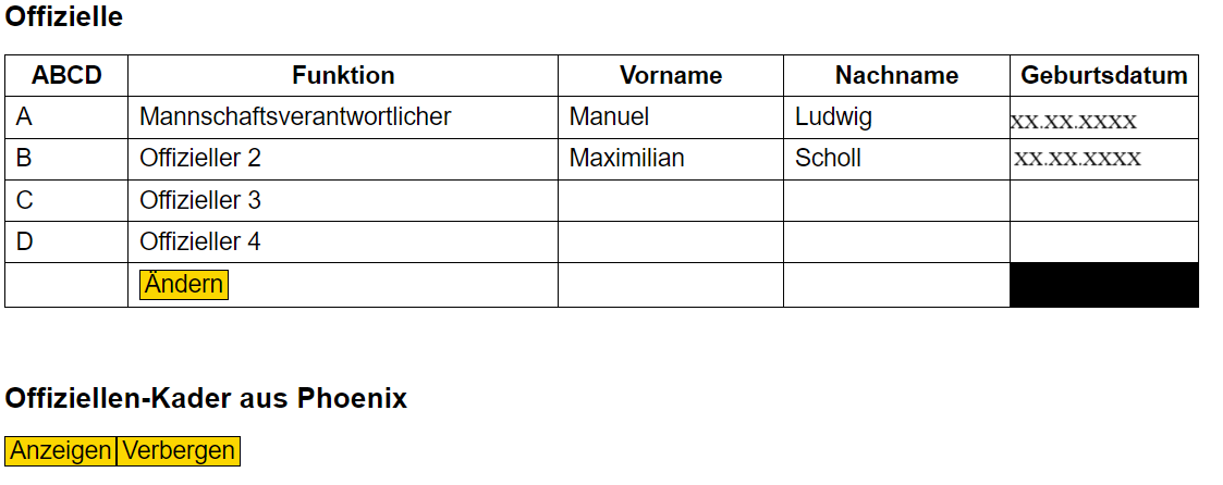 Nun folgt der Datenbereich “Offizielle”. Hier muss man nun die Mannsnchaftsverantwortlichen eintragen. Dies beginnt mit einem Klick auf den Button “Ändern”. Danach kann man die Felder mit Vor- und Nachnamen füllen. Die Angabe des Geburtsdatums ist nicht zwingend erforderlich.