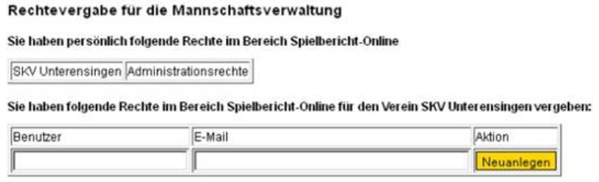 Durch Auswahl des Menüpunktes Rechteverwaltung öffnet sich eine Bildschirmmaske auf der dann der Benutzernamen und die E-Mail-Adresse der berechtigten Person hinterlegt werden können. Zusätzlich ist hier das Recht zur Mannschaftsverwaltung anzugeben.