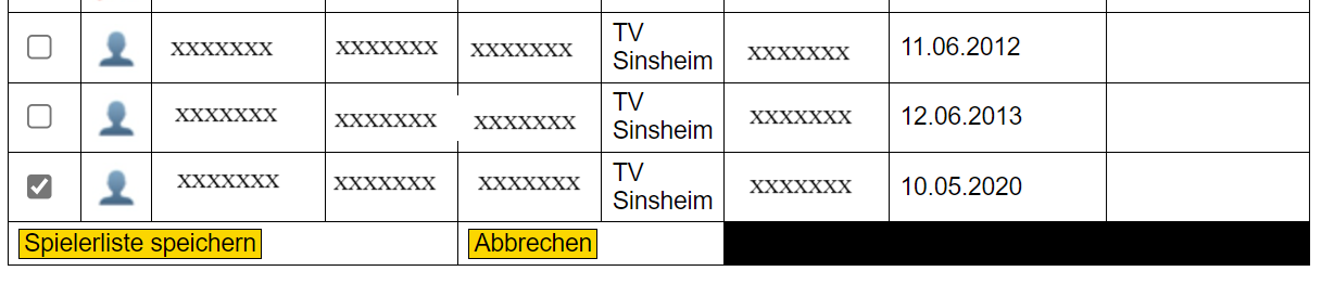 - Die Liste enthält die Informationen Nachname, Vorname, Geburtstag (nachfolgend aus datenschutzrechtlichen Gründen gelöscht), Verein und Passnummer. Die Spalte SBO dient der Auswahl jener Spieler, die in die Mannschaftsliste mit aufgenommen werden sollen. Die Auswahl erfolgt durch einfachen Klick auf das Feld in der ersten Spalte. Ein ausgewählter Spieler erhält dann einen Haken in der Ansicht.