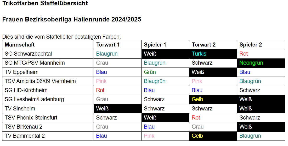 Der nachfolgende Bereich des Bildschirms zeigt die Trikotfarben der weiteren in der Staffel befindlichen Teams.