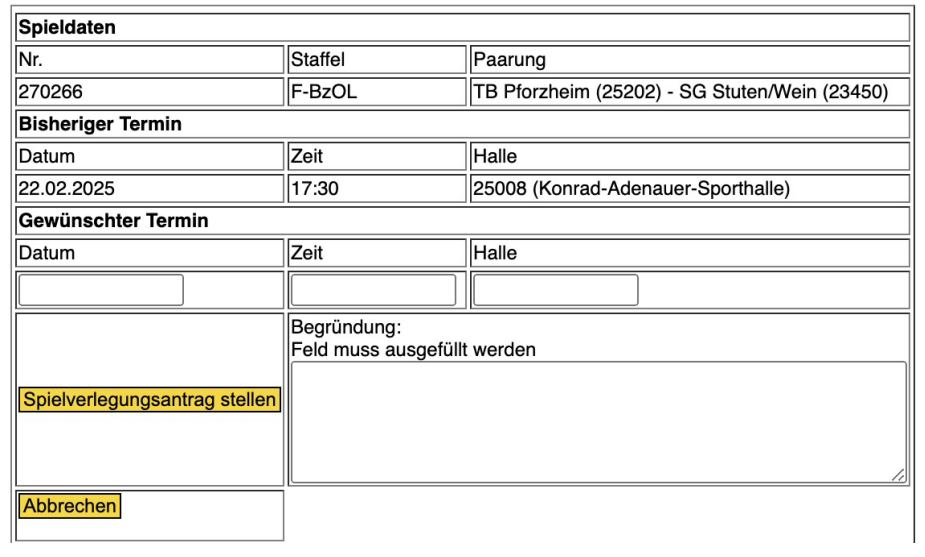 Mit Klick auf „Neue Spielverlegung beantragen“ und nach Eingabe der Spielnummer