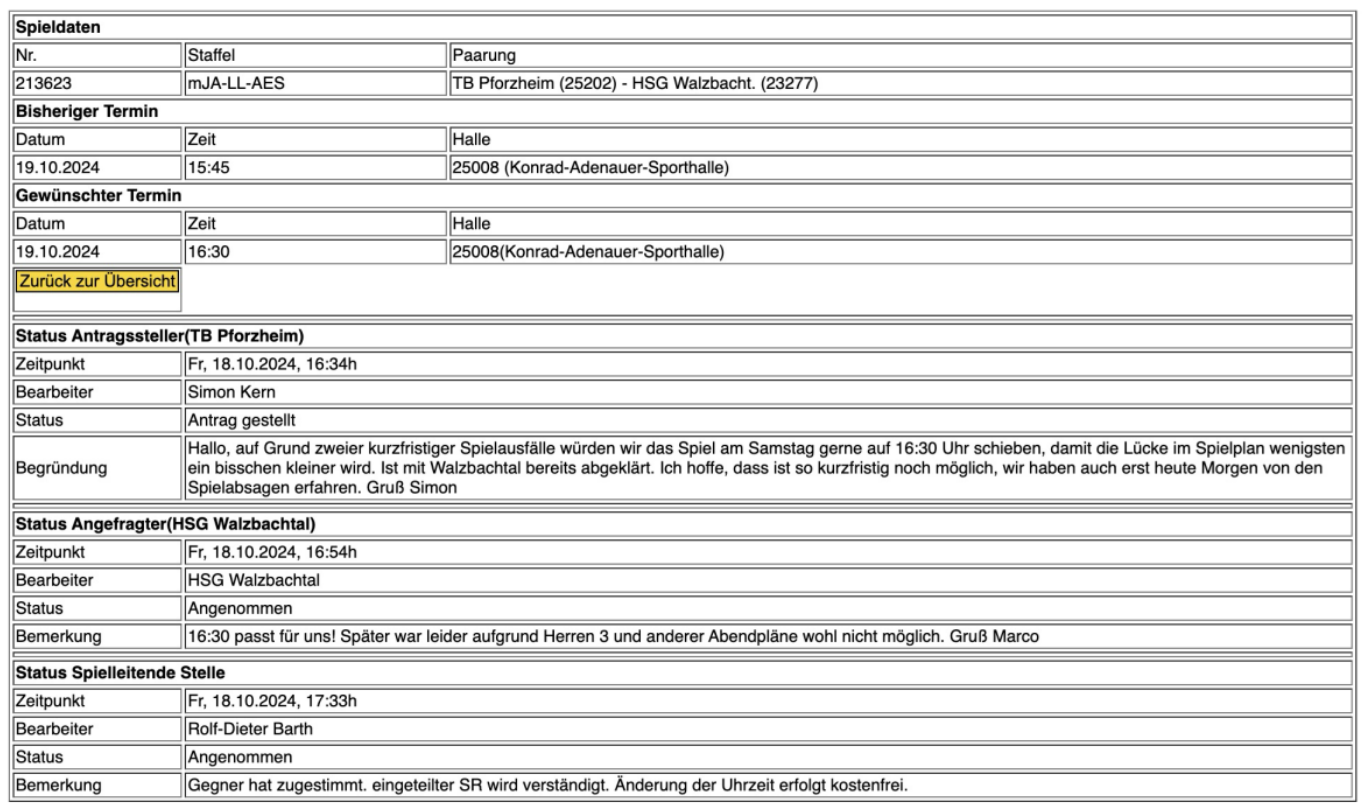Einsicht durch Nutzer mit entsprechender Berechtigung bereit. In der Detailsicht läßt sich der Status der Spielverlegung nachverfolgen.