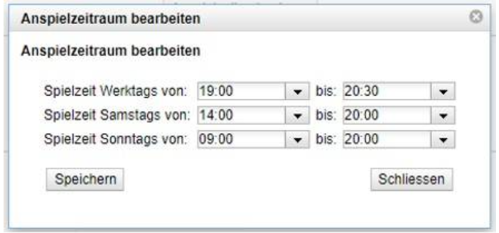 Durch „kopieren“ öffnet sich ein weiteres Fenster, in dem man eine Auswahl der möglichen Spielzeiten, die vorher im Rahmenspielplan eingegeben wurden, angezeigt bekommt. Durch „bearbeiten“ öffnet sich ein weiteres Fenster, in dem man die spezielle Auswahl nur für diese Staffel eingeben kann.
