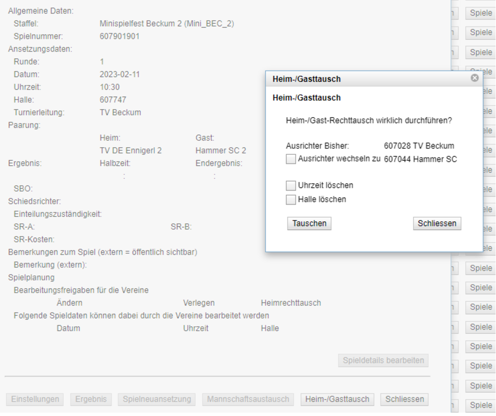 Nun muss auf jeden Fall der Kasten vor dem Feld “Ausrichter wechseln… ” angeklickt werden. Sollen Uhrzeit und Halle gelöscht werden, so müssen auch diese Felder angeklickt werden. Nachdem die notwendigen Haken gesetzt wurden, klickt man auf “Tauschen” und das Heimrecht wird getauscht.