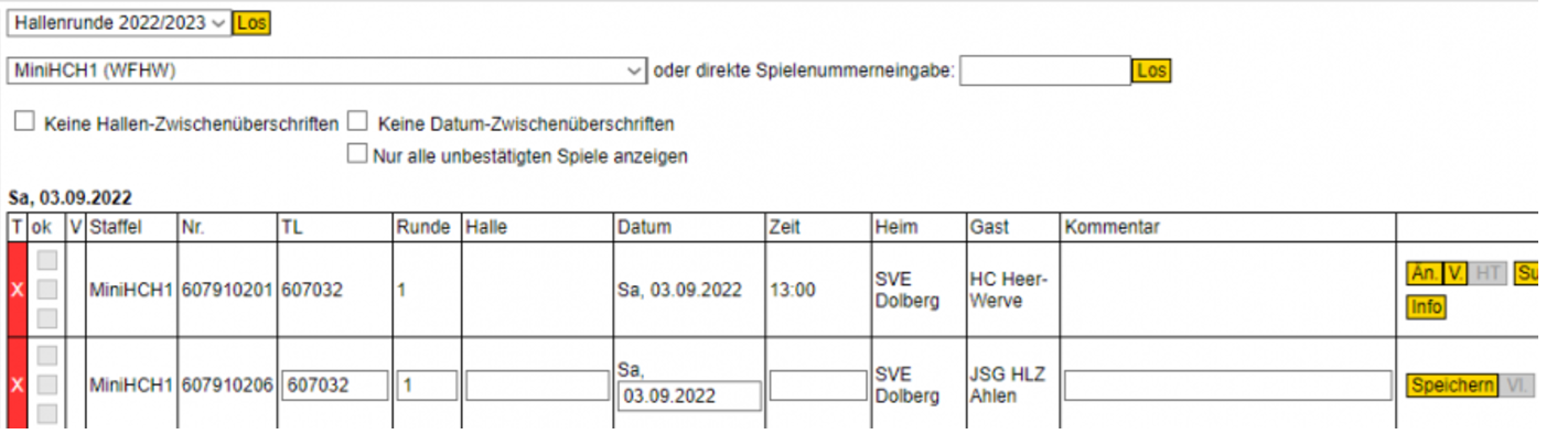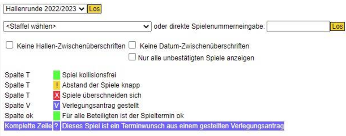 Als Filtermöglichkeit lässt sich die entsprechende Saison, eine Staffel, eine bestimmte KW oder auch eine Spielnummer wählen. Die Anzeige kann durch das Setzen der Haken in die Felder “Keine Hallen-Zwischenüberschriften, Keine Datum-Zwischenüberschriften und Nur alle unbestätigten Spiele anzeigen” weiter gefiltert werden. Durch Klick auf den “Los” Button wird die Suche ausgeführt.