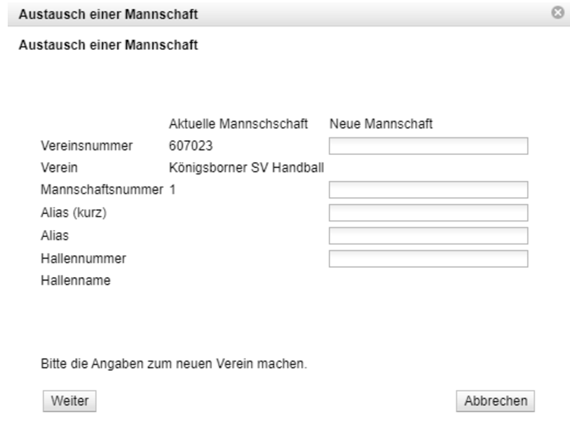 Hat man sich bei der Eingabe der Mannschaften vertan, so kann man hier die Mannschaft austauschen. Hier trägt man die Daten der neuen Mannschaft ein, bestätigt dies hier und im nächsten Schritt.