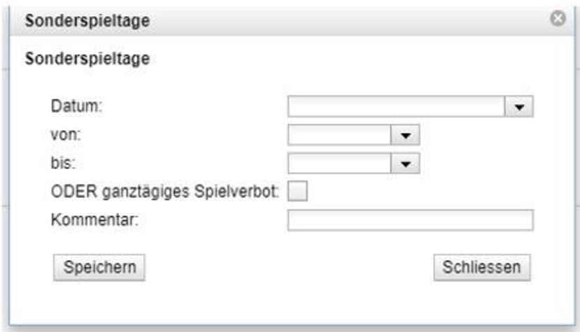 Durch „kopieren“ öffnet sich ein weiteres Fenster, in dem man eine Auswahl der möglichen Sonderspieltag, die vorher im Rahmenspielplan eingegeben wurden, angezeigt bekommt. Durch „bearbeiten“ öffnet sich ein weiteres Fenster, in dem man die spezielle Auswahl nur für diese Staffel eingeben kann.