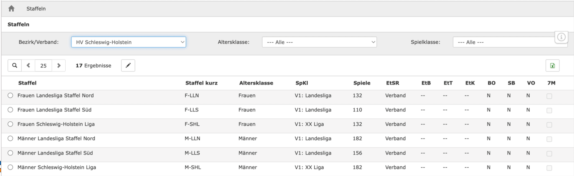 Nach einloggen ins System und der Auswahl der Rolle “Spielplan Admin” wird unter dem Menüpunkt “Staffeln” die Staffelübersicht angezeigt.